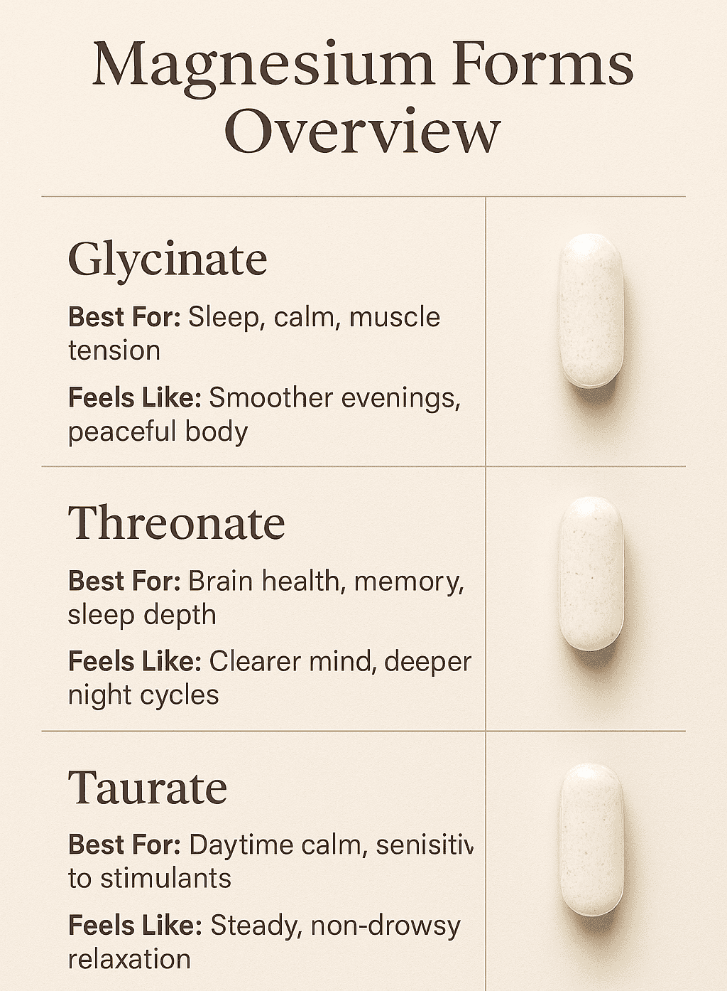 If you want one simple answer: glycinate is the most reliable starting point. If your goal is more brain-focused support, consider threonate. If you want daytime calm without drowsiness, taurate is often a great fit. And if digestion is the priority (or budget is tight), citrate can be useful — just respect that it’s more gut-active.